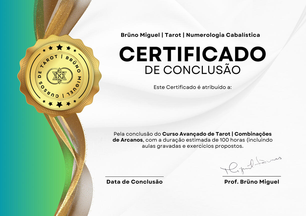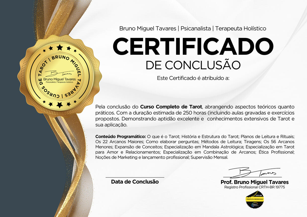 Se tornar um profissional de Tarot certificado, com conhecimento abrangente de uma das tiragens mais importantes do Tarot?Com uma metodologia simples, leve e focada totalmente no essencial para o aluno. Sem fantasias e complicações desnecessárias ou foco em assuntos que em nada contribuem para o aprendizado inicial do Tarot.Comprovada por mais de 500 alunos, irá ajudar você a se tornar um(a) Tarólogo(a) muito mais preparado(a)!