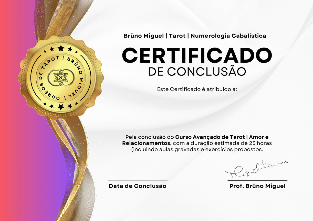 Você gostaria de dominar as principais técnicas e conhecimentos do Amor e Relacionamentos nas suas consultas?Os assuntos sobre amor podem ultrapassar os 90% de perguntas nas nossas consultas! É essencial avançar os seus estudos nesta área se quer melhor aconselhar os seus consulentes.Com uma metodologia simples, leve e focada totalmente no essencial para o aluno. Sem fantasias e complicações desnecessárias ou foco em assuntos que em nada contribuem para o aprendizado inicial do Tarot.